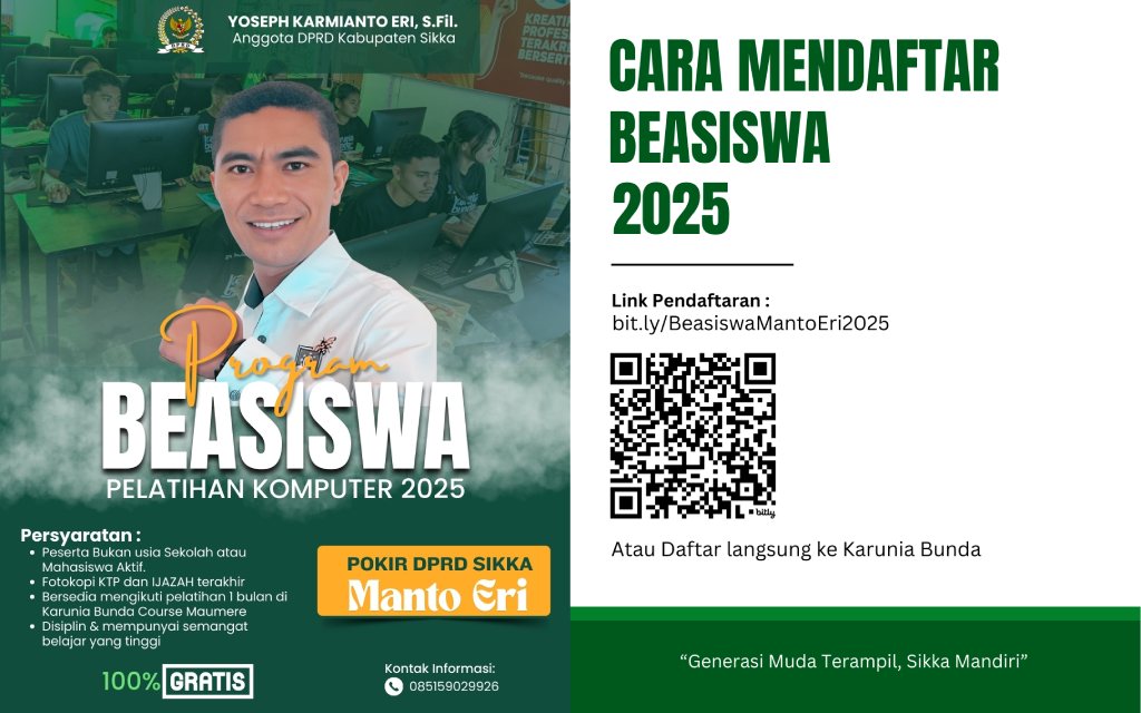 Maumere, NTT — Di tengah tantangan dunia kerja yang semakin ketat, secercah harapan datang dari seorang wakil rakyat yang tak hanya duduk di kursi legislatif, tapi turun langsung merasakan denyut kebutuhan masyarakat. Yoseph Karmianto Eri, S.Fil., Anggota DPRD Kabupaten Sikka dari Fraksi PKB, kembali membuktikan komitmennya terhadap masa depan generasi muda Sikka dengan meluncurkan Program Beasiswa Pelatihan Komputer Aplikasi Perkantoran & Desain Grafis, hasil kolaborasi strategis bersama lembaga pelatihan Karunia Bunda Course Maumere.